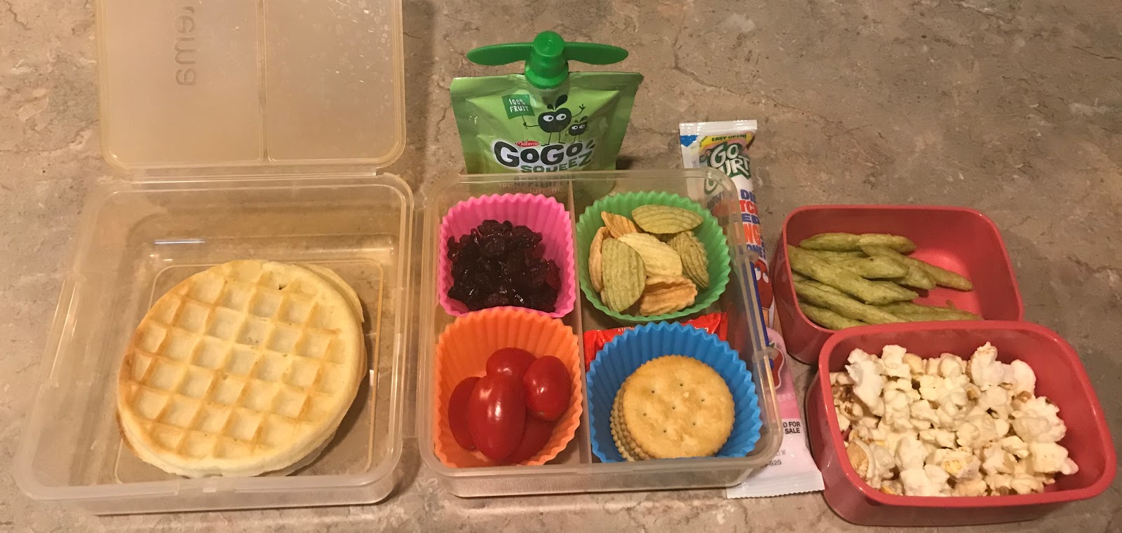 Mac & cheese cups, cherry tomatoes, apples with sunbutter, popcorn, dried peas |